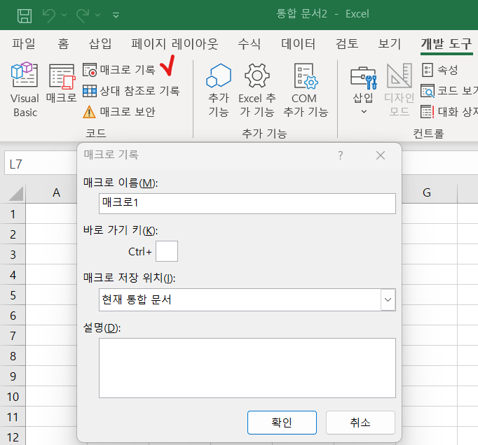 - 매크로 이름을 입력하고 "확인"을 누릅니다.