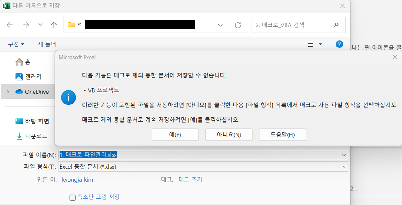 매크로가 포함된 엑셀 파일은 .xlsm 형식으로 저장해야 합니다. 일반 .xlsx 형식으로 저장하면 매크로가 삭제되므로 주의하세요.