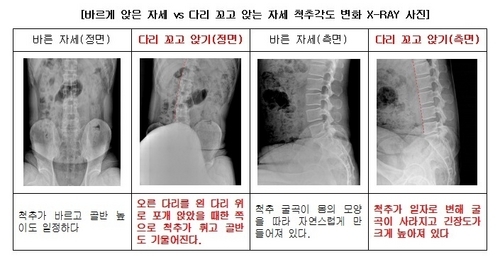 - 다리를 꼰 자세는 좌골신경, 대퇴정맥, 반월상연골 등에 비정상적인 하중과 압박을 가합니다.