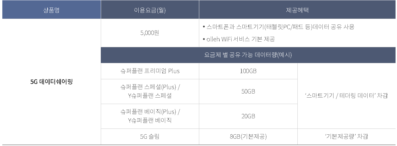 - 5G 스마트폰 요금제가 별도 나눠쓰기/쉐어링 데이터를 제공하지 않는 경우 기본 제공량 내에서 나눠쓸 수 있습니다.