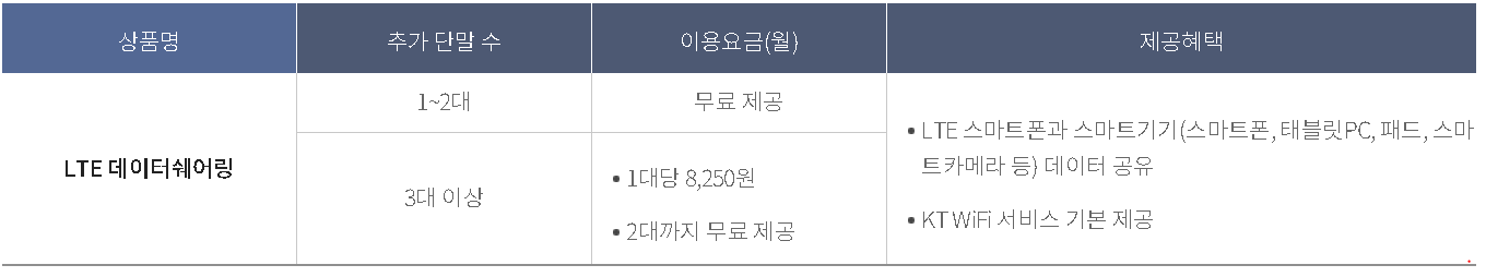 - 최대 2대까지 무료로 LTE 데이터쉐어링을 이용할 수 있고, 3번째 기기부터 요금이 부과됩니다