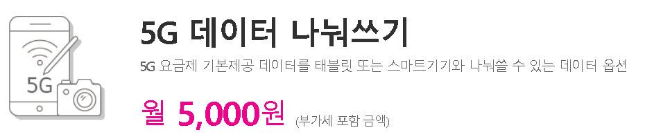 - 5G 스마트폰 요금제가 별도 나눠쓰기/쉐어링 데이터를 제공하는 경우 나눠쓰기/쉐어링 데이터 제공량 내에서 나눠 쓸 수 있습니다.