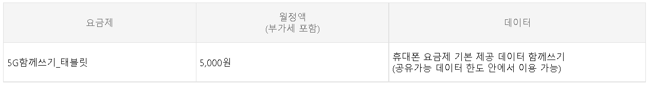 | 5G 제공량 초과 시 | 최대 400kbps 속도로 지속 이용 가능 | 최대 200Kbps 속도로 지속 이용 가능 | 기기 별로 각각의 데이터 초과 이용요금이 발생 |